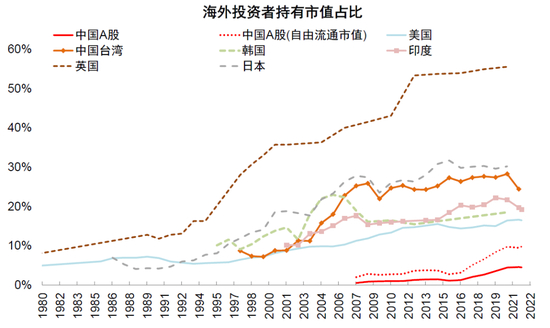 图表34:海外投资者的市值占比相比全球仍有上升空间