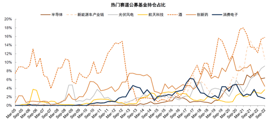 图表53:2022年公募基金热门赛道集中度整体下降,创新药、新能源车产业链仓位大幅下降