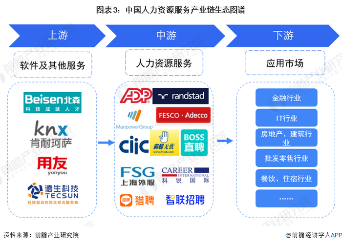 人力资源服务上游系统服务商主要包括北森、肯耐珂萨、用友等,社保相关服务供应商德生科技等;中游有人力资源服务企业主要包括ADP、任仕达、万宝盛华、德科等外企,也包括中智、前锦网络、科锐国际、猎聘等中国企业。