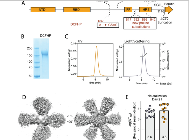 这项研究显示,DCFHP-alum疫苗可以在非人灵长类动物中产生强效、持久、广谱的中和抗体(由适应性免疫应答细胞分泌的一种可溶性蛋白)。虽然是基于最早的原始毒株序列进行设计,但DCFHP-alum疫苗却能在非人灵长类动物中,引发对SARS-CoV-2(新冠病毒)变种和SARS-CoV-1(SARS病毒)强大且广谱的中和抗体反应,并且持续时间可以超过250天。