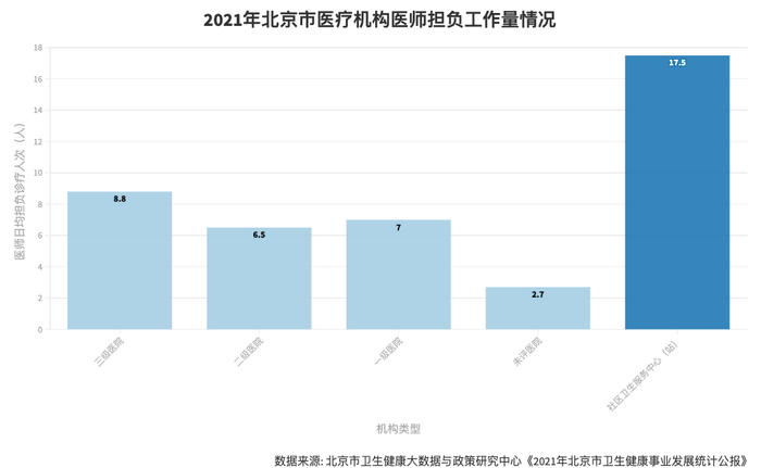 平心而论,社区卫生服务中心的接诊能力并不比大型医院差。研究中心的数据显示,北京市社区卫生服务中心(站)2021全年诊疗人次数达6487.6万人次,占全市医疗机构的26.8%;医师日均担负诊疗人次打17.5人次,超过全市医疗机构8.4人次的平均值。