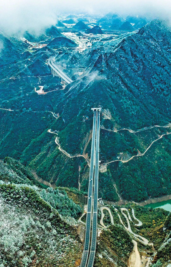 一桥飞架南北,天堑变通途。路网纵横乡野,云雾笼山岭。群山万壑间,一座大桥连接村寨与县城,沿线群众正式告别山路“五道拐”时代,交通动脉更加有力,发展循环更加通畅。此图使用无人机拍摄,从高处俯瞰大桥穿山而过的雄伟景象,意境壮阔,气势磅礴。