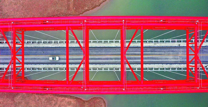 照片中的这座大桥,并不是所谓的“超级工程”,也没有创造这样或那样的“世界第一”,甚至它连接的两岸,是在地图上都难寻踪迹的乡村公路。但作为“渡改桥”工程,这座大桥的建成通车,切实消除了渡运安全隐患,方便了周边群众出行。这些或许微小,但实实在在的惠民工程,同样值得被记录。而俯拍视角,红色线条,在构图和色彩上,也为这张照片增色不少。