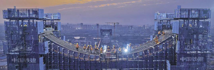 俯瞰展馆顶部,钢架线条明朗,施工有条不紊。此图兼具几何韵律与色彩之美,银白色的钢铁结构仿若涟漪,自展馆顶部中心向外层层扩散,构成规整半圆;湖蓝色的玻璃幕墙渐次安装,为半圆镀上色彩,丰富画面层次;橙色的吊机与身着黄色服装的工人是点睛之笔,为画面注入暖意。忙碌有序的施工进程,折射出经济社会持续恢复的向好态势。