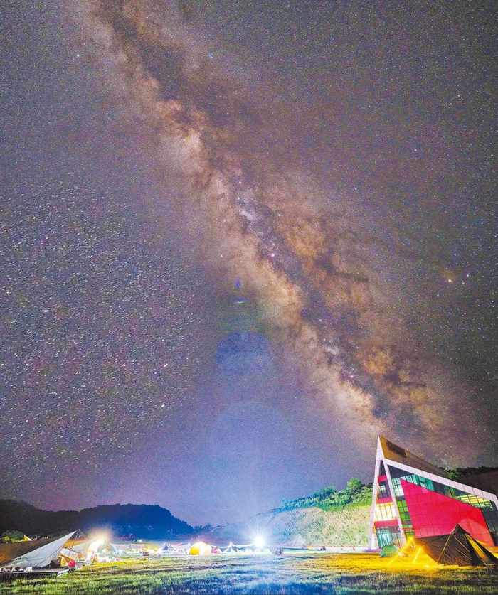 图片采用竖片的形式,将繁星闪烁的夜空与景区的帐篷同时囊括其中,帐篷的顶部刚好指向了呈条带状的浩瀚银河,形式感极强。地面的灯光与夜空的星光巧妙地形成呼应,光彩夺目,虽非身临其境,但由远及近看到无垠的银河,能切身感受到空气的通透。我国蓝天保卫战取得显著成效,空气质量得到明显改善。