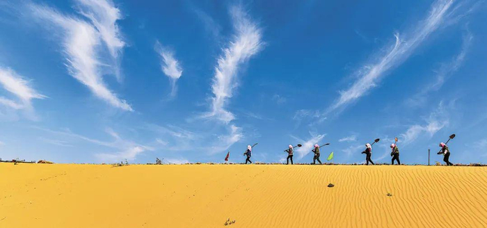 湛蓝色的天空、明黄色的沙漠,从沙坡下方仰头向上取景,得到了这样色彩鲜明的构图。在两种颜色的交界处,几位扛着铁锹的治沙人员迈着坚定的步伐整齐前行,为这张图片增添了韵味。摄影师定格下的这个瞬间,也是对打好蓝天保卫战的生动诠释:锁住黄沙、治理沙化土地,我们永远在路上。