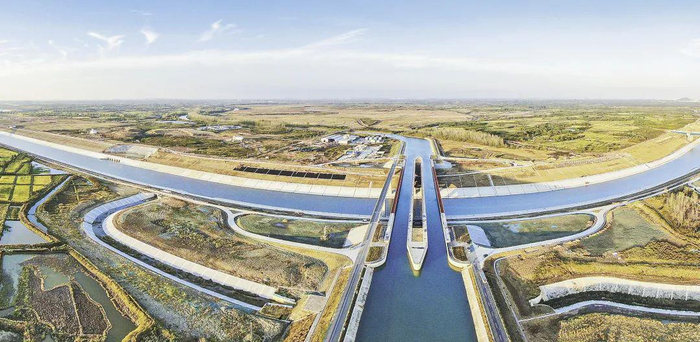 历时六年,沟通长江、淮河两大水系,平行于京杭大运河的第二条南北水运大动脉——引江济淮工程实现试通水试通航。这张图片截选了该工程的地标性节点——世界上单跨最大的钢结构渡槽淠河总干渠渡槽来透视这一工程的重要意义。一渠清水在江淮运河上凌空而过,形成河上有河的“水上立交”奇观。一带运河绵延蜿蜒,千里扬波北上,福泽江淮大地,正在开启一个宽广无垠的新时代。逢山开路、遇水架桥,正是伟大时代,造就了伟大工程。