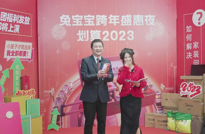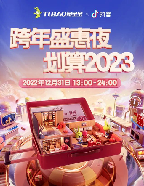 为了感恩消费者一直以来对兔宝宝的支持,2022年12月31日13:00——24:00,兔宝宝利用跨年时间节点,以抖音大流量平台,盛大开启“兔宝宝跨年盛惠夜 划算2023——总部超长直播 年终狂欢盛典”。