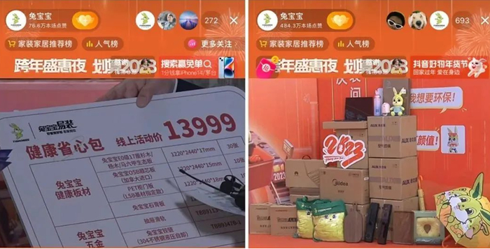 健康超值包、健康省心包,各种套餐中都加入了兔宝宝健康板材以及装修中必不可少的五金,为了让装修无忧兔宝宝还特别推出了材料加油包,直接涵盖了生态板、OSB、柜门板、滑轨、铰链、石膏板,以及护墙系列所有产品,用实惠的组合套餐形式,在美好的跨年夜里,开启专属您的装修梦!另外,直播间还推出了超多福袋整点秒,粉丝朋友们热情高涨,多轮互动感恩礼赠,掀起直播间一波波高能热浪。