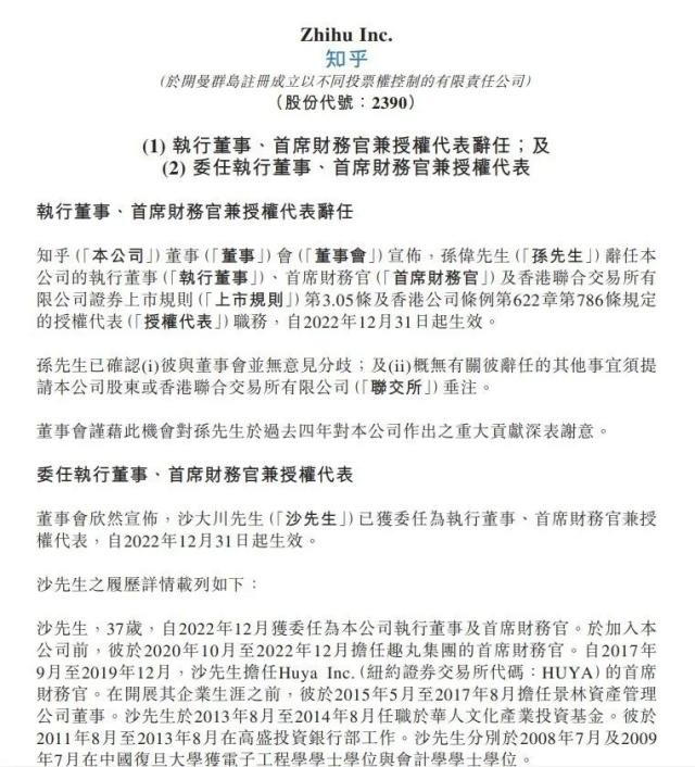 对此,知乎董事长兼首席执行官周源对孙伟过去四年的工作表示感谢,尤其强调了其在知乎纽约证券交易所和香港联合交易所两次成功上市方面的贡献。