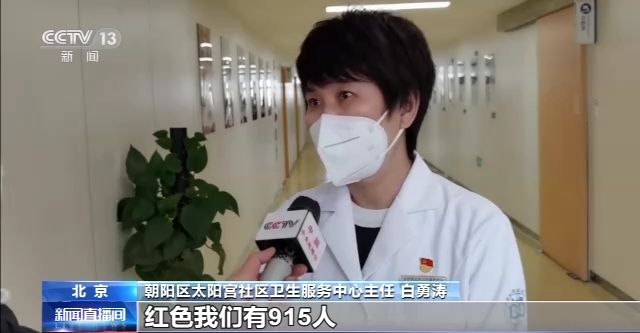 朝阳区太阳宫社区卫生服务中心主任 白勇涛:红色有915人,这些人是我们要重点关注的,我们的家庭医生都跟他们取得了联系,建立了一人一台账。这两周我们通过家庭医生,帮助3个独居的老人转诊,也是得益于前期打通了医联体转诊的途径。