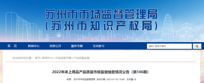 中国质量新闻网讯 2023年1月3日,江苏省苏州市市场监督管理局网站发布2022年床上用品产品质量市级监督抽查情况公告(第106期)。2022年三季度,苏州市市场监督管理局委托苏州市纤维检验院对床上用品产品质量实施了市级监督抽查。