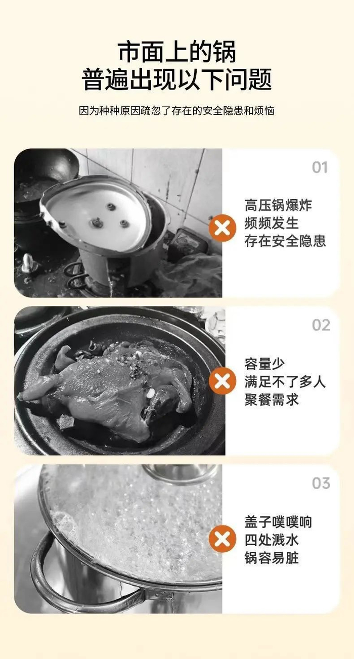 7、不建议爆炒、烹炸食物,避免烹饪有坚硬外壳的食材(如螺丝、花甲类、筒骨等)。