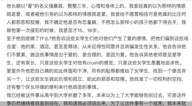 12月29日,有网友在社交平台上发文称,她于2017年在湖南省长沙市雅礼中学就读期间,遭到名为“Travis Tate”的外籍男教师骚扰和性侵,且第一次被侵犯时只有15、16岁,并称对方长期以“爱”的名义强迫她,“整整三年,心理和身体上,我曾经真的以为那样的情感就是爱。”