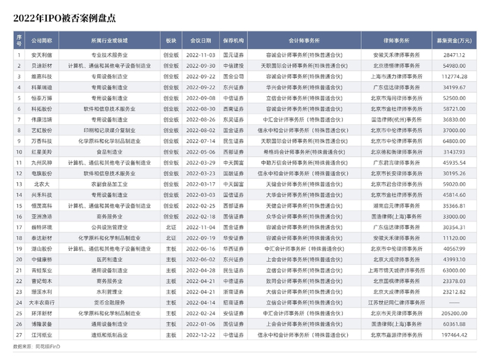 2022年的IPO审核落下帷幕,同花顺(300033)iFinD及各交易所官网数据显示,各板块2022年被否案例合计达到27家,其中创业板16家,主板9家,北交所2家,科创板无被否案例;注册制下合计194家企业撤回申报。