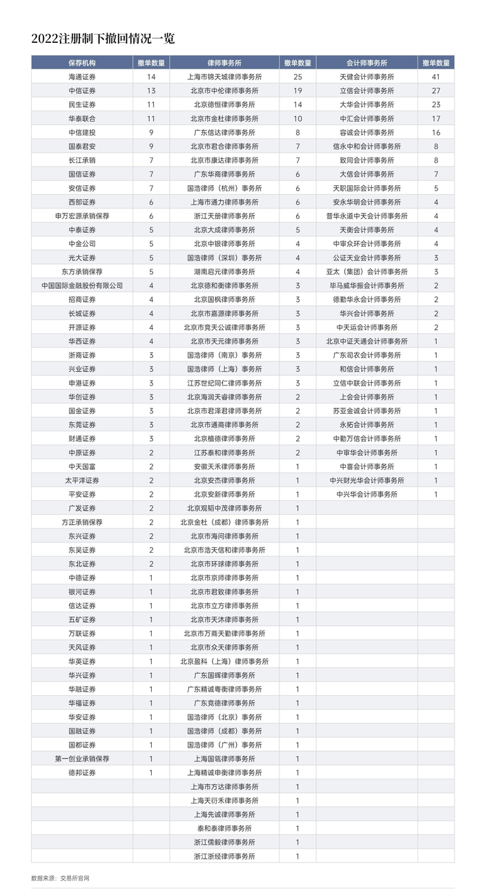 194家撤回企业中,有14家由海通证券担任保荐机构,海通证券也由此获得2022年注册制“逃单王”;数量次之的则是中信证券,撤回13单,获得亚军;民生证券与华泰联合分别撤回11单,并列第三。