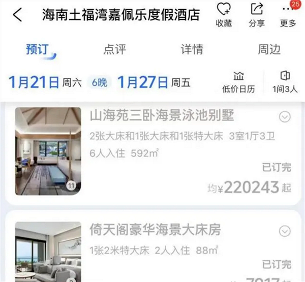 随着预订量暴涨的还有“房价”。近日,一张酒店价格截图在许多游客朋友圈中刷屏——图中显示,三亚嘉佩乐酒店基础海景房春节期间标价超5000元/晚、别墅房型更是卖出超22万元/晚的天价。