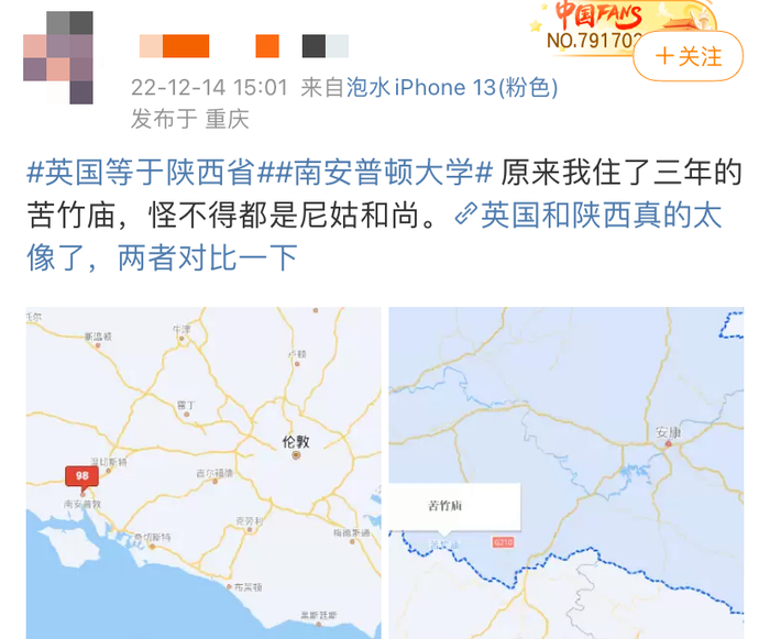甚至还有人把英国的各大城市按照地理位置与陕西比对,发现了某种惊人的相似之处。