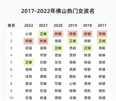 记者留意到,2017年-2021年,每年佛山男孩热门名字第一名的,名字中都带有“梓”字,2022年首次出现带“梓”字姓名跌出榜首的情况。不过即使如此,前十名中,仍有四个男孩名字带有“梓”字。