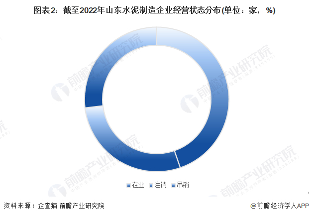 根据中国企业数据库企查猫,目前山东水泥制造行业的在业企业293家,占比为45%;注销企业数量占总企业数的28%。