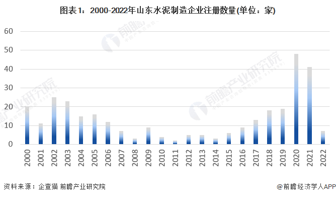 根据中国企业数据库企查猫,目前山东水泥制造行业的主要企业共有657家,其中以2020年为主要注册热潮,2020年水泥制造企业注册数量为48家,2021年注册企业数量为41家。
