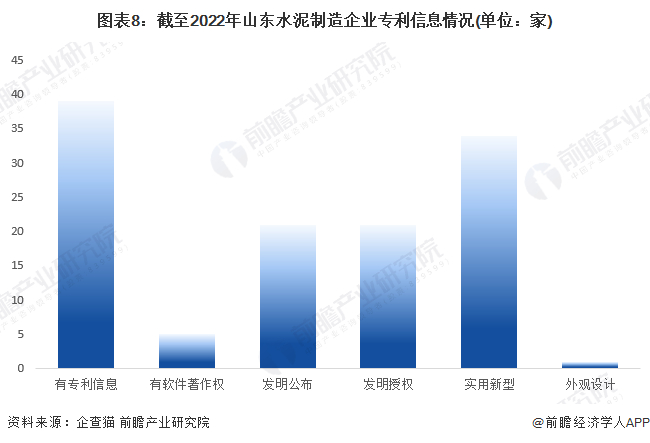 根据中国企业数据库企查猫,目前山东省存续和在业的水泥制造企业共293家,其中39家企业有专利信息,5家企业有软件著作权。在专利信息中,水泥制造企业以实用新型专利为主,申请实用新型的企业有34家,拥有发明信息公布的企业有21家。