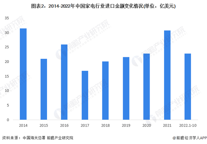 2014-2018年我国家电行业进口额波动变化,2017年以来呈上升趋势。2021年,我国家电行业进口额为30.74亿美元,同比增长34.77%。总体看,在2020年疫情恢复之后,我国家电行业的进口贸易有所提高。2022年1-10月,中国家电进口金额为22.74亿美元,同比下降9.2%。