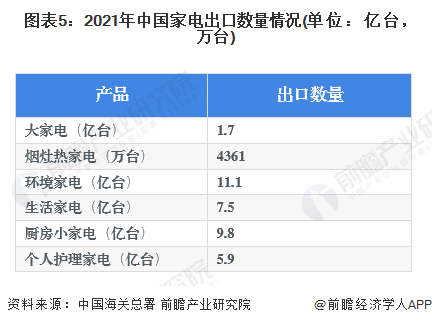从中国家电产品出口数量看,2021年环境家电、厨房小家电等出口量较大。环境家电出口量为11.1亿台,厨房小家电出口量达到9.8亿台。