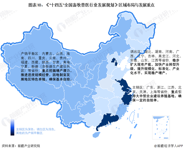 根据经济社会发展水平、资源环境承载能力、市场消费需求等因素,将全国生猪养殖业划分为调出区、主销区和产销平衡区。调出区包括湖北、湖南、河南、广西、辽宁、吉林、黑龙江、河北、安徽、山东、江西等省份,稳步扩大现有产能,加快产业转型升级,提升规模化、标准化、产业化水平,实现稳产增产。主销区包括广东、浙江、江苏、北京、天津、上海等省份,重点引导大中型企业建设养殖基地,确保一定的自给率。产销平衡区包括内蒙古、山西、海南、四川、重庆、云南、贵州、福建、西藏、陕西、甘肃、青海、宁夏、新疆(含新疆生产建设兵团)等省份,重点挖掘增产潜力,推进适度规模经营,因地制宜发展地区特色养殖,确保基本自给。