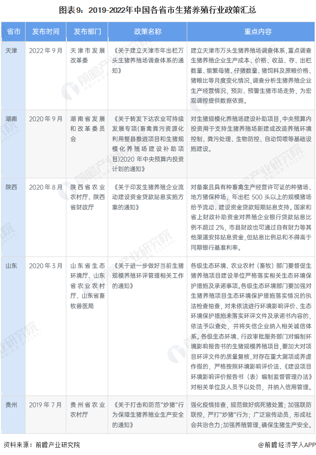 2019-2022年,天津、湖南、陕西、山东等部分省市也发布了生猪养殖行业政策,主要涉及资金贷款补贴、生态环境保护、打击防范“炒猪”行为等。
