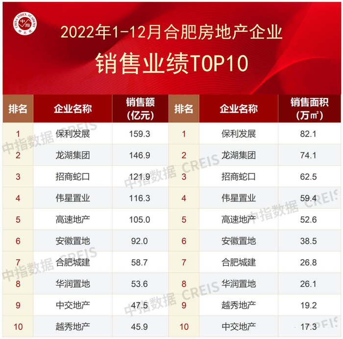 特别声明:合肥房地产企业销售数据统计是以2022年1月1日-12月31日期间全市(合肥市九区三县及庐江县、巢湖市)销售的全口径商品房为统计口径,主要依据中指数据CREIS(点击查看)在合肥的销售监测数据,并参考当期总体经营情况和推盘去化情况进行分析统计;对于少数没有在监测范围内的项目,由企业提供相关证明文件,经课题组对数据进行严格审核,也纳入统计范围。本报告仅供参考,课题组不对使用报告及其内容所引发的任何直接或间接损失承担责任。