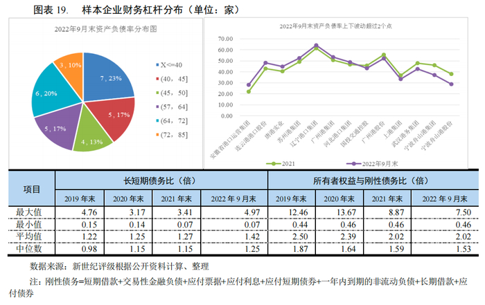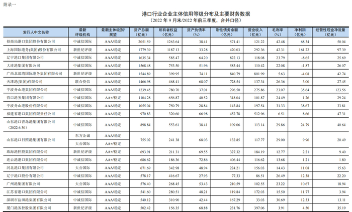 本部分行业样本分析以截至2022年9月末在公开市场上有存续债券的35家港口企业为分析标的,最新财务数据口径计算基数为2022年前三季度(末);针对尚未披露2022年前三季度报表的样本企业,最新财务数据口径计算基数则调整为2022年上半年度(末)。本部分利润表和现金流量表的部分科目数据则使用年化数据(2022年(E))。