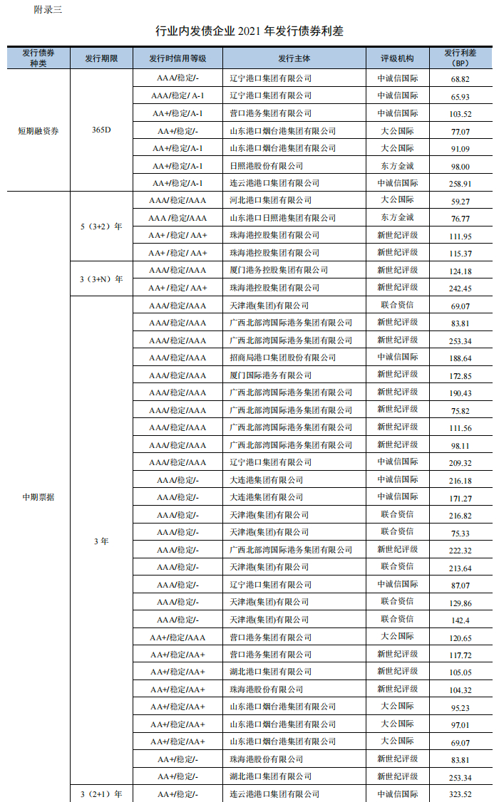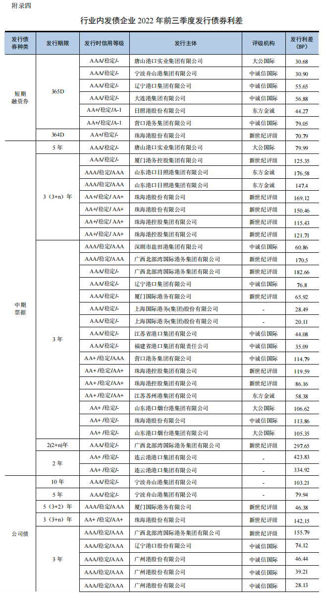 2021年,我国港口行业企业共发行11支公司债券,主体信用等级为AAA级和AA+级的利差均值分别为73.03BP和132.37BP;2022年前三季度共发行16支公司债券,主体信用等级为AAA级和AA+级的利差均值分别为57.21BP和142.15BP。