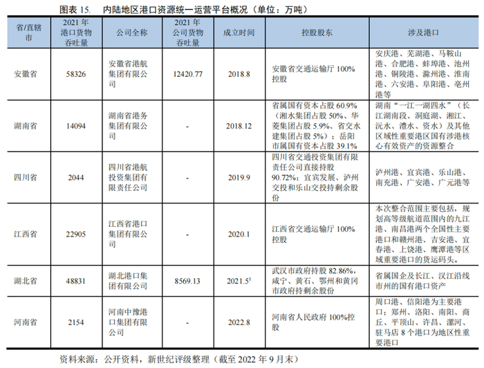 随着沿海地区掀起港口资源整合浪潮,拥有长江内河资源的内陆省份也开始参与其中,目前,已有六个内陆省份成立了省级港口集团,分别为安徽省、湖南省、四川省、江西省、湖北省和河南省。其中,安徽省和湖北省的港口货物吞吐量已形成一定规模,2021年分别完成5.83亿吨和4.88亿吨,但与沿海地区相比,仍存在一定差距。我国内陆地区的港口资源统一运营平台如下图所示: