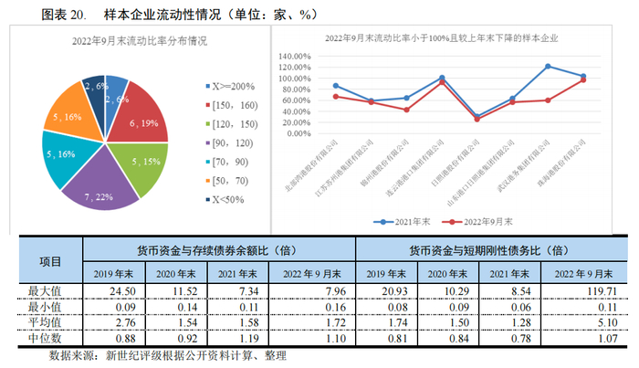 从流动性指标来看,2022年9月末,样本企业中共13家企业的流动比率较上年末出现下滑;同期末,共16家企业的流动比率低于100%,其中,流动性最差的为日照港股份有限公司。从货币资金情况来看,港口行业的货币资金持续保持在较为充沛的水平,近三年一期末,对存续债券及短期刚性债务的覆盖倍数持续大于1,能为债务的按期偿付提供较好保障。