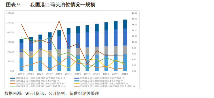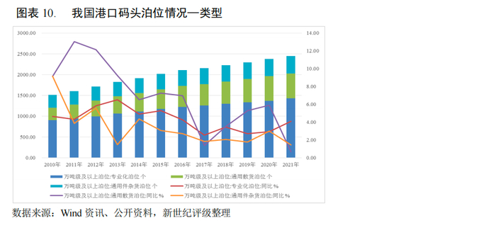 同时,为提高港口码头作业效率并提升竞争力,我国港口亦在不断加强对专业化码头的投资建设,2021年末,我国万吨级及以上泊位中,专业化、通用散货和通用件杂货泊位数量分别为1427个、596个和381个,较上年末分别增长4.08%、0.68%和1.45%,增速同比分别上升1.15个百分点、下降5.22个百分点和下降1.53个百分点。