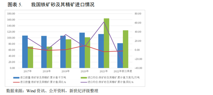 我国港口吞吐的金属矿石以进口铁矿石为主,自2014年我国铁矿石对外依存度首次超过80%以后,铁矿石对外依存度居高不下。铁矿石进口量与粗钢产量有较为直接的关系。2022年以来,新冠疫情多点散发,钢厂开工率下降,我国铁矿砂及其精矿进口数量下降,再加上铁矿石价格波动较大,影响到贸易商的囤货意愿,短期内铁矿石继续缺乏上涨动力,2022年前三季度,我国铁矿砂及其精矿进口数量为8.23亿吨,同比减少2.31%,预计我国港口的金属矿石吞吐情况将持续承压。