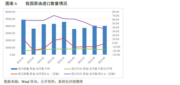 我国港口吞吐的石油、天然气及制品以进口原油为主,2021年,我国原油对外依存度为72%,持续处于高水平。2022年以来,受国际部分地区局势动荡的影响,国际原油价格大涨,并维持震荡高位运行态势,影响到贸易商的囤货意愿,2022年前三季度,我国原油进口数量为3.70亿吨,同比下降4.3%,预计我国港口的原油吞吐情况亦面临较大下行压力。