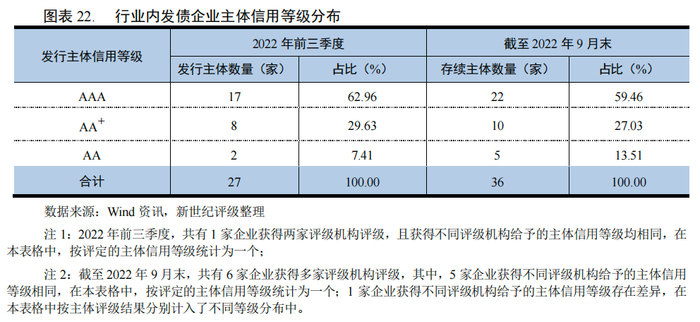 截至2022年9月末,我国港口行业共有36家企业公开市场拥有存续债券,其中22家企业的主体信用等级为AAA级,10家企业的主体信用等级为AA+级,5家企业的主体信用等级为AA级。