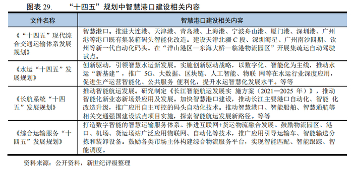 随着我国经济加速转型升级,港口行业对大数据、云计算等技术的需求亦有所提升,叠加新冠肺炎疫情爆发后的持续性影响,预计我国港口的智能化信息化码头建设加快。智慧港口的建设主要体现在两方面,一个是硬件方面的建设,一个是软件方面的建设。硬件建设主要体现为自动化码头的建设,随着我国港口的大型化和集约化发展,自动化码头建设亦在加快,自动化码头的建设将大力提升码头的作业效率;软件方面的建设主要是将信息技术融入经营管理,实现智能监管和智能服务,提升港口对相关资源的优化配置能力。