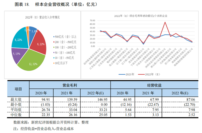 从营业收入来看,2022年(E),样本平均值为185.67亿元,保持增长态势;营业收入分布于100(含)~200亿元区间的企业数量最多,共12家;同期,共13家企业的经营收益为负值,其中2家企业的主业经营亏损面超过10亿元,分别为大连港集团有限公司和辽宁港口集团有限公司。从综合毛利率来看,2022年(E),样本企业综合毛利率的平均值和中位数分别为22.72%和23.10%,同比波动不大,但明显低于港口业务毛利率水平,主要系大部分港口企业拓展了盈利能力偏低的贸易业务所致(约25家样本企业从事了贸易业务)。2022年(E),18家样本企业的综合毛利率有所下滑,降幅最明显的为锦州港股份有限公司,主要原因预计系部分高费率货种吞吐量下降、防疫成本增加等原因综合所致。