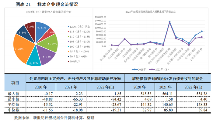 港口业务获现能力很强,大部分样本企业营业收入现金率总体上处于较高水平,2022(E)年,营业收入现金率平均值和中位数分别为114.84%和103.62%,较上年度分别上升3.85个百分点和2.60个百分点;同期,共3家样本企业的营业收入现金率低于90%,其中,营业收入现金率最低的企业系山东港口日照港集团有限公司,主要原因系其建筑安装业务收入规模较大,而该业务现金回笼能力相对偏弱所致。从经营性现金流来看,2022年(E),15家企业的经营性净现金流入较2021年有所减少,但所有样本企业的经营性现金流均呈净流入状态,其中,经营性现金净流入规模最小的系武汉港务集团有限公司,主要原因系其受老港搬迁影响,新码头产能尚未完全释放,主业创现能力较弱所致。