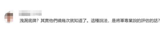对于张延廷“泄露底牌”一说,有岛内网友讽刺道:泄露底牌?其实他们绕几次就知道了。这种说法,是将军专业说的评估的话?↓