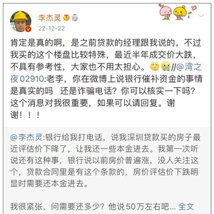 都市快报讯 最近,一位知名数码博主在微博发帖称,自己在深圳贷款买的房子评估价下跌,银行致电要求他补足50万元左右的本金。