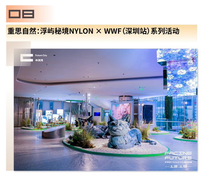 中洲湾与近20位国内外知名艺术家、设计师达成合作,在商场内部、下沉广场和户外空间打造了19个艺术打卡点,创造出一个富有体验感的沉浸式艺术场,让观者置身其中宛如漫游艺术之境。
