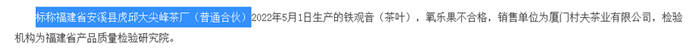 该抽检信息显示,厦门村夫茶业有限公司销售的,标称福建省安溪县虎邱大尖峰茶厂(普通合伙)2022年5月1日生产的铁观音(茶叶)(规格型号:250g/盒),氧乐果不合格。检验机构为福建省产品质量检验研究院。