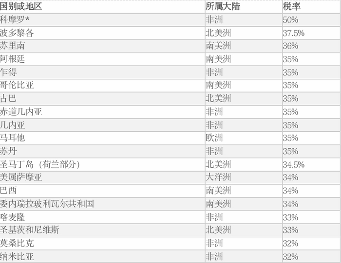 公司所得税法定税率最高的20个国家几乎涵盖了每个地区,但不平等。虽然前20个国家中有8个在非洲,但大洋洲只有一个经济体,欧洲有两个经济体。在其余的司法管辖区中,四个在北美,五个在南美洲。