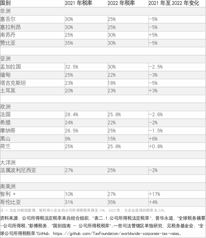 16 个国家/地区在 2022 年更改了公司所得税法定税率。六个国家提高了本国的公司所得税法定税率:哥伦比亚(31%至35%),南苏丹(25%至30%),荷兰(25%至25.8%),土耳其(20%至23%),智利(10%至27%)和黑山(9%至15%)。