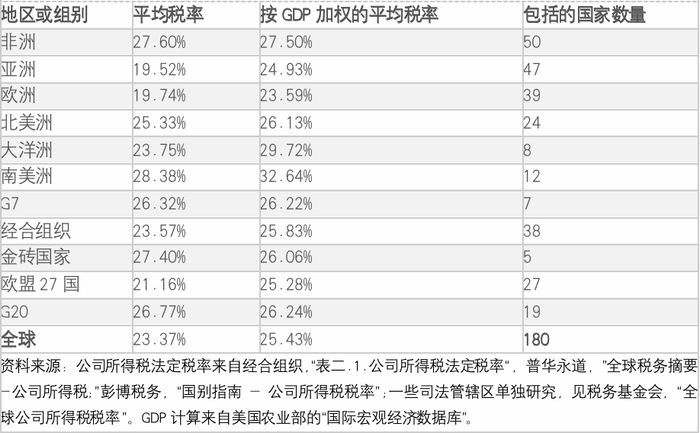 全球180个司法管辖区测算的公司所得税法定税率的平均值为23.37%。按GDP加权时,法定税率的平均值为25.43%。