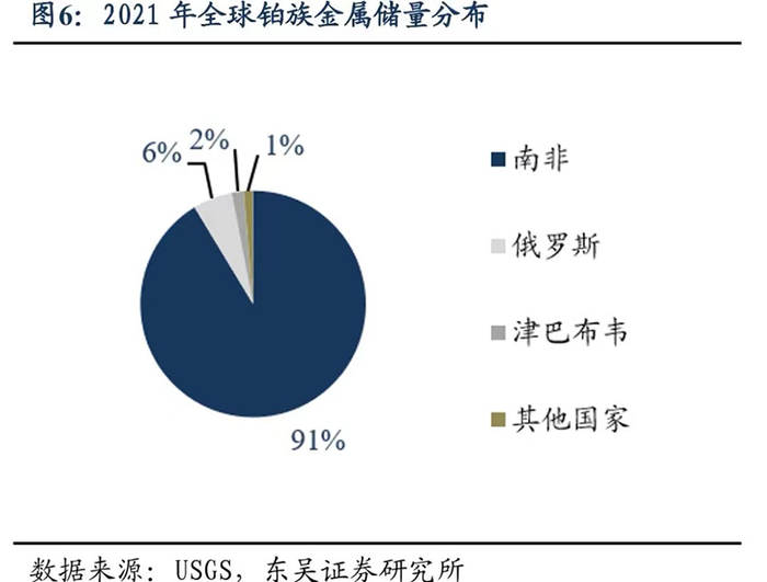 美国地质调查局数据显示,全球超90%的铂族金属储量位于南非。俄罗斯拥有全球第二大的铂族金属储量,占比为6%。